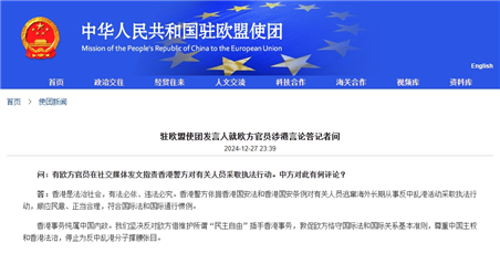 当地时期12月27日,针对有欧方官员在酬酢媒体发文谴责香港警方对相干东谈主员遴荐法则行径,驻欧盟使团发言东谈主回复称,香港是法治社会,有法必依、坐法必究。香港警方依据香港国安法和香港国安条例对相干东谈主员逃遁国际永久从事反中乱港算作遴荐法则行径,稳当民心、正大合理,相宜国际法和国际通行旧例。