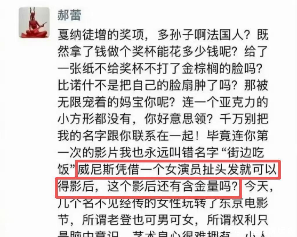 没念念到,就在电影上映的前一天,也等于11月6号,网上瞬息爆出一条疑似郝蕾一又友圈的发文截图,那句“威尼斯凭借一个女演员扯头发就不错得影后,这个影后还有含金量吗?”就差说出辛芷蕾三个字了,指向性太彰着。