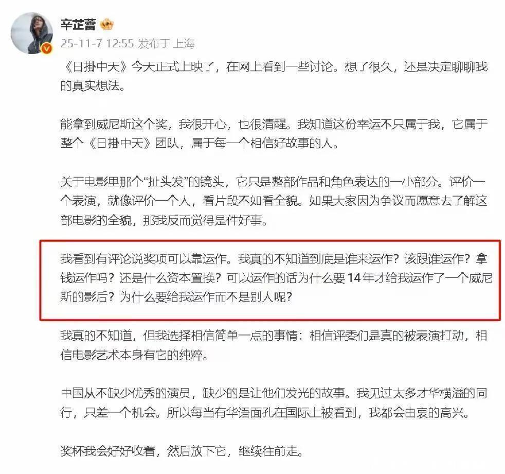 辛芷蕾没在怕的,11月7号,电影上映本日中午,她发长文进行恢复,驳诘传言,若是奖项不错运作,为什么14年才给她?为什么运作给了她而不是别东说念主?她敬佩艺术的隧说念,敬佩评委是被她的饰演打动。