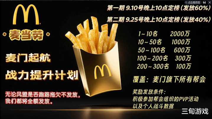 而三大势力最风头浪尖的东谈主物,非麦当劳定约的馒头莫属,在风定约发出补贴确本日,搞定层也披发了一份战力提高权术,对旗下总计帮会成员进行补贴。