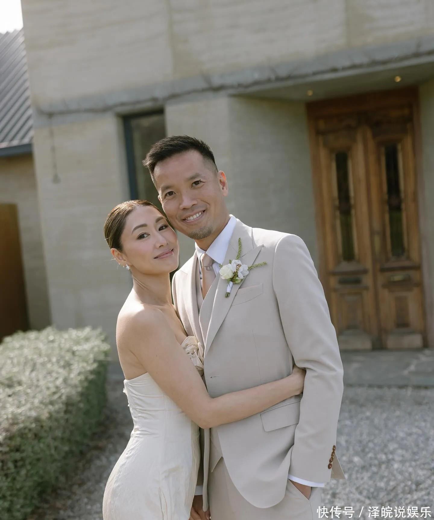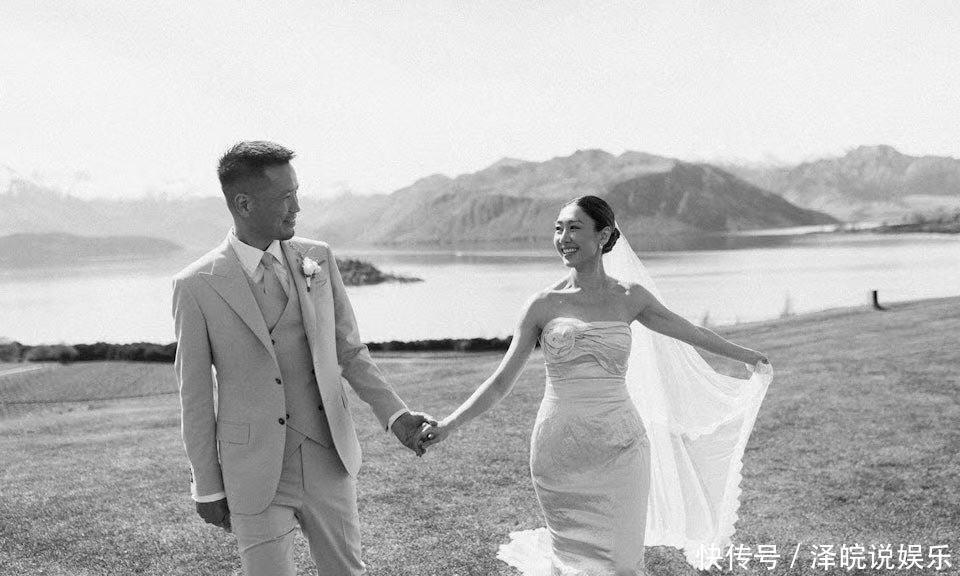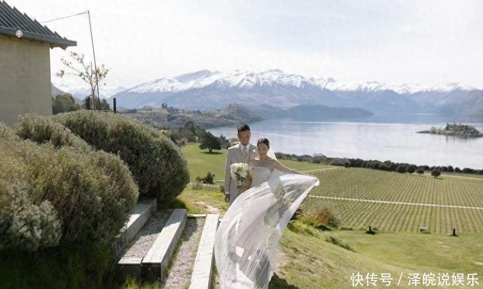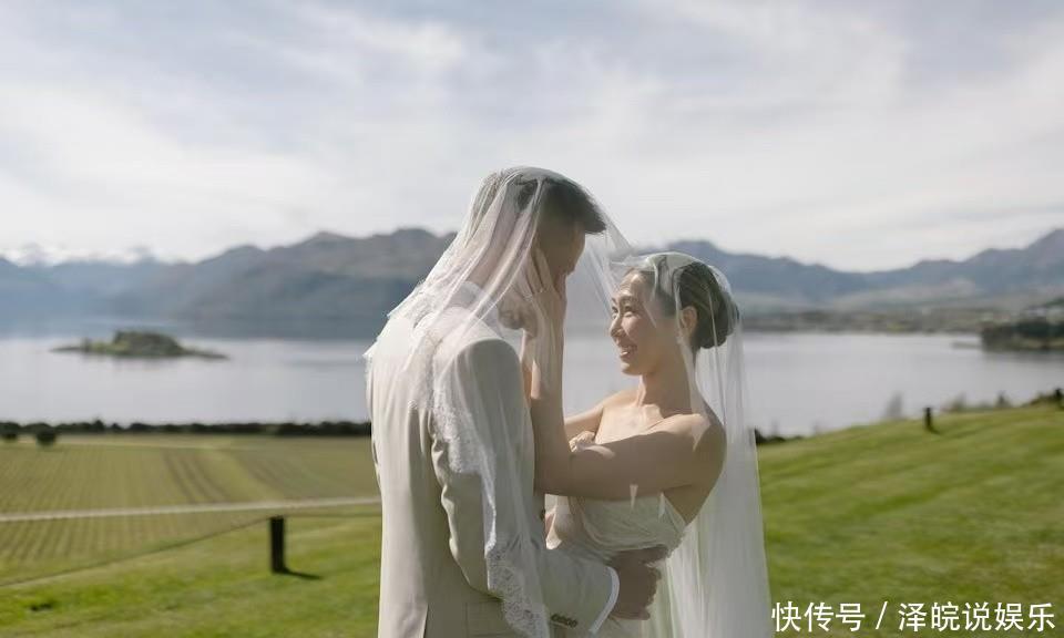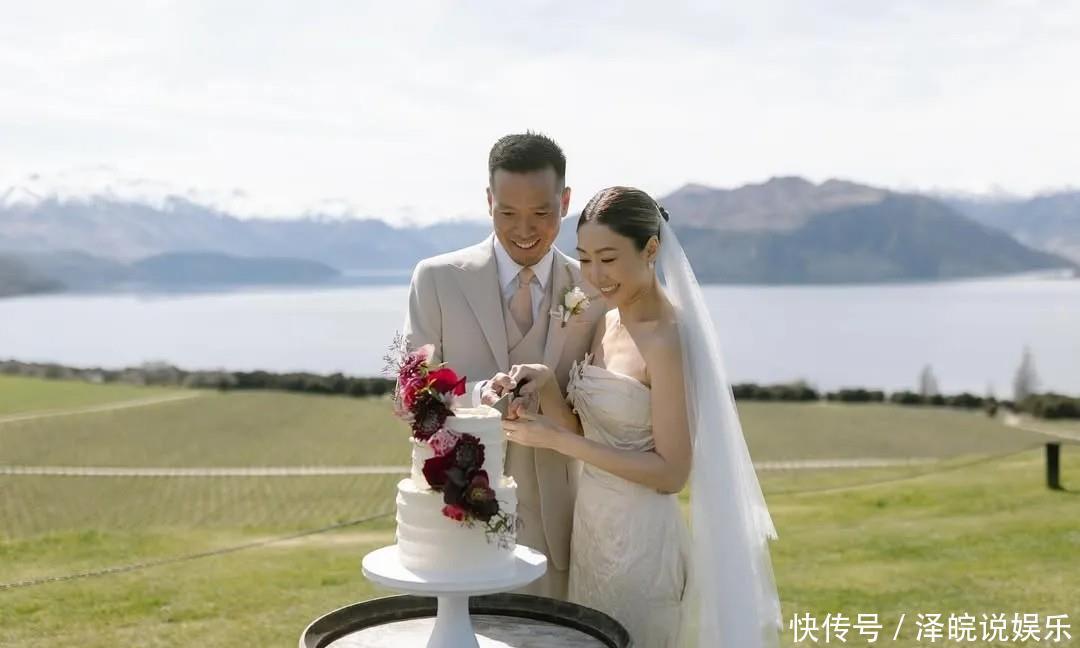像片中可见,两东谈主在开朗的草地举行浅近婚典,胡定欣穿上露肩白色婚纱,两东谈主手牵手甜密对望及切蛋糕。