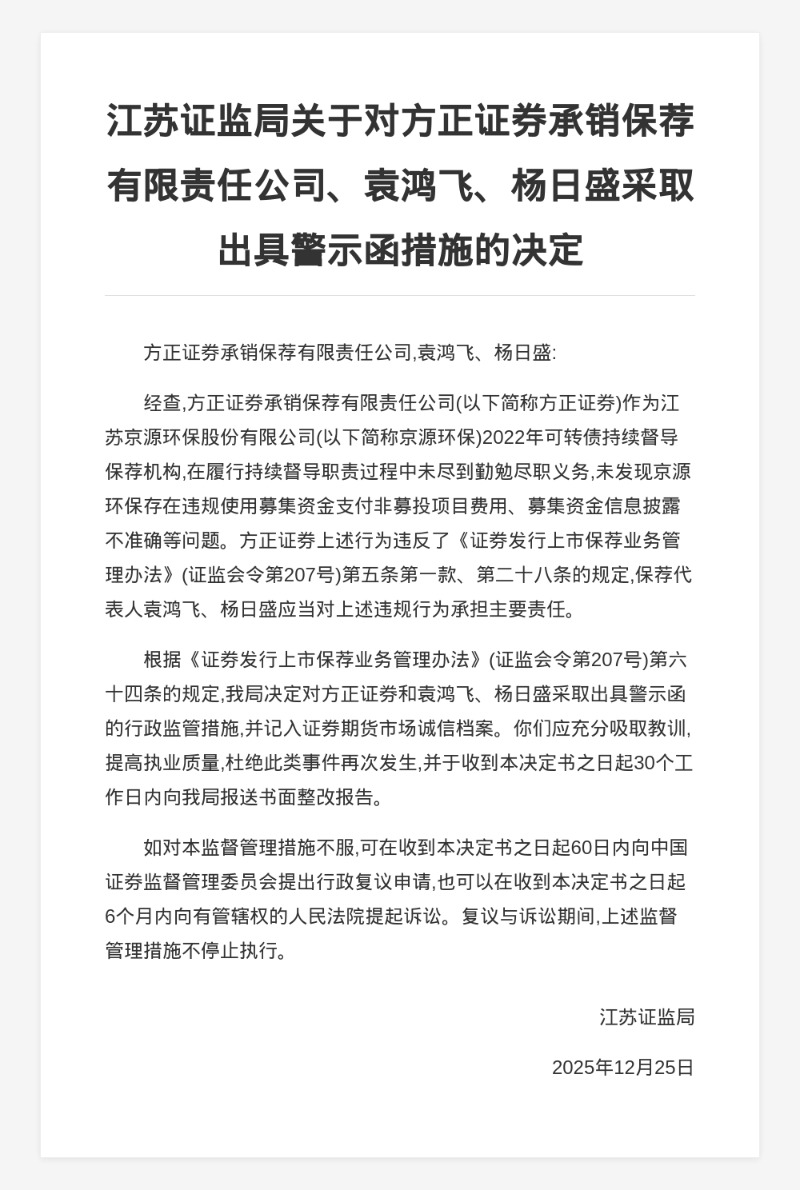 决定书涌现,正派证券承销保荐有限包袱公司手脚江苏京源环保股份有限公司2022年可转债握续督导保荐机构,在扩张握续督导使命历程中未尽到用功尽责义务,未发现京源环保存在违纪使用召募资金支付非募投阵势用度、召募资金信息表露不准确等问题。上述举止违背了《证券刊行上市保荐业务处理目的》的规则,保荐代表东说念主袁鸿飞、杨日盛应当对上述违纪举止承担主要包袱。